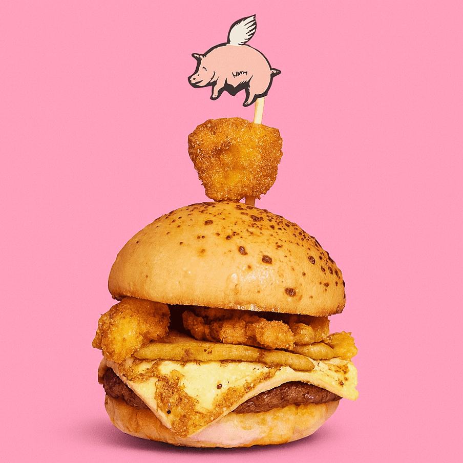Pan artesanal con queso parmesano + trozos de pechuga de pollo apanados + queso papialpa asado + reducción de vino rosado + rodaja de piña dulce asada + carne de res y cerdo + coronada con crocante piña apanada + acompañante a su elección.