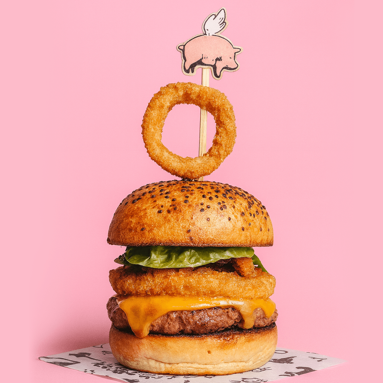 Pan artesanal con parmesano + carne de res y cerdo + queso cheddar + doble tocineta + cogollo europeo + 3 aros de cebolla crocantes bañados en reducción balsámica y rociados con queso grana padano + coronada con otro crujiente aro de cebolla + acompañante de su elección