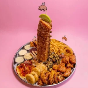 1 chicharrón del chef + 6 chicharrón wings pigasus + 2 mazorcas pigasus +3 arepitas de chicharrón + 5 dedos de queso papilapa + 1 papas casco + 1 papas a la francesa + Alioli de ajo y salsa de chile dulce.